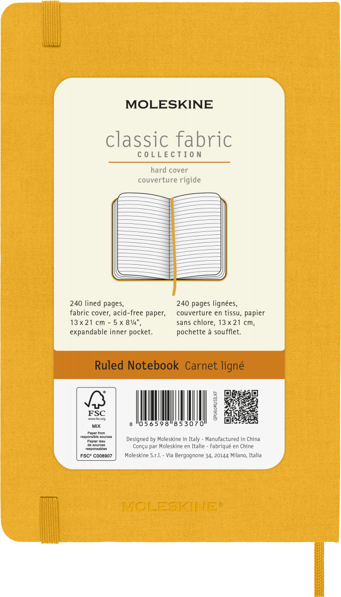 Moleskine 'Color Collection' 2022. En serie notesbøger i glade farver med hårdt stofomslag. Holder en høj kvalitet og indeholder hele 240 sider. Andre karakteriska er runde hjørner, matchende bogmærkebånd, inderlomme til løse notater samt 70g FSC-certificeret elfenbensfarvet syrefrit papir.