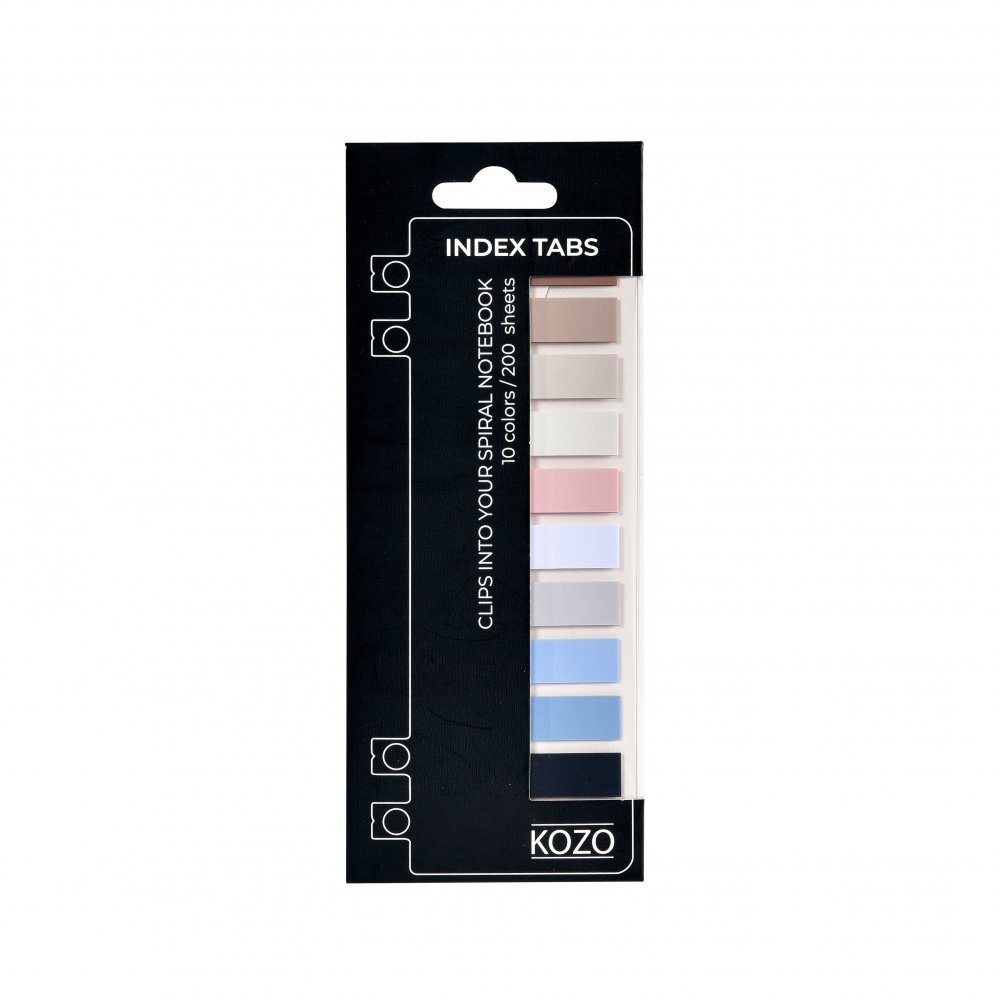 KOZO Index faner i stilfulde, neutrale farver er selvklæbende og aftagelige for nem mærkning og organisering. Indeholder i alt 200 faner i 10 forskellige trendy farver. Passer fint sammen med andre KOZO-produkter og passer især godt til KOZO Premium Notebook.