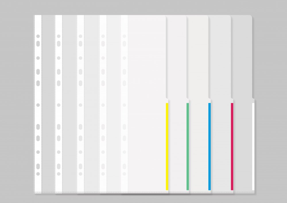 Gennemsigtige lommer i A4-format med multiperforering og farvekode. Med åben top og halvvejs nede i højre side. Fremstillet af miljøvenlig polypropylen. Lommerne er kopisikre og kan rumme op til 25 ark (80gsm).