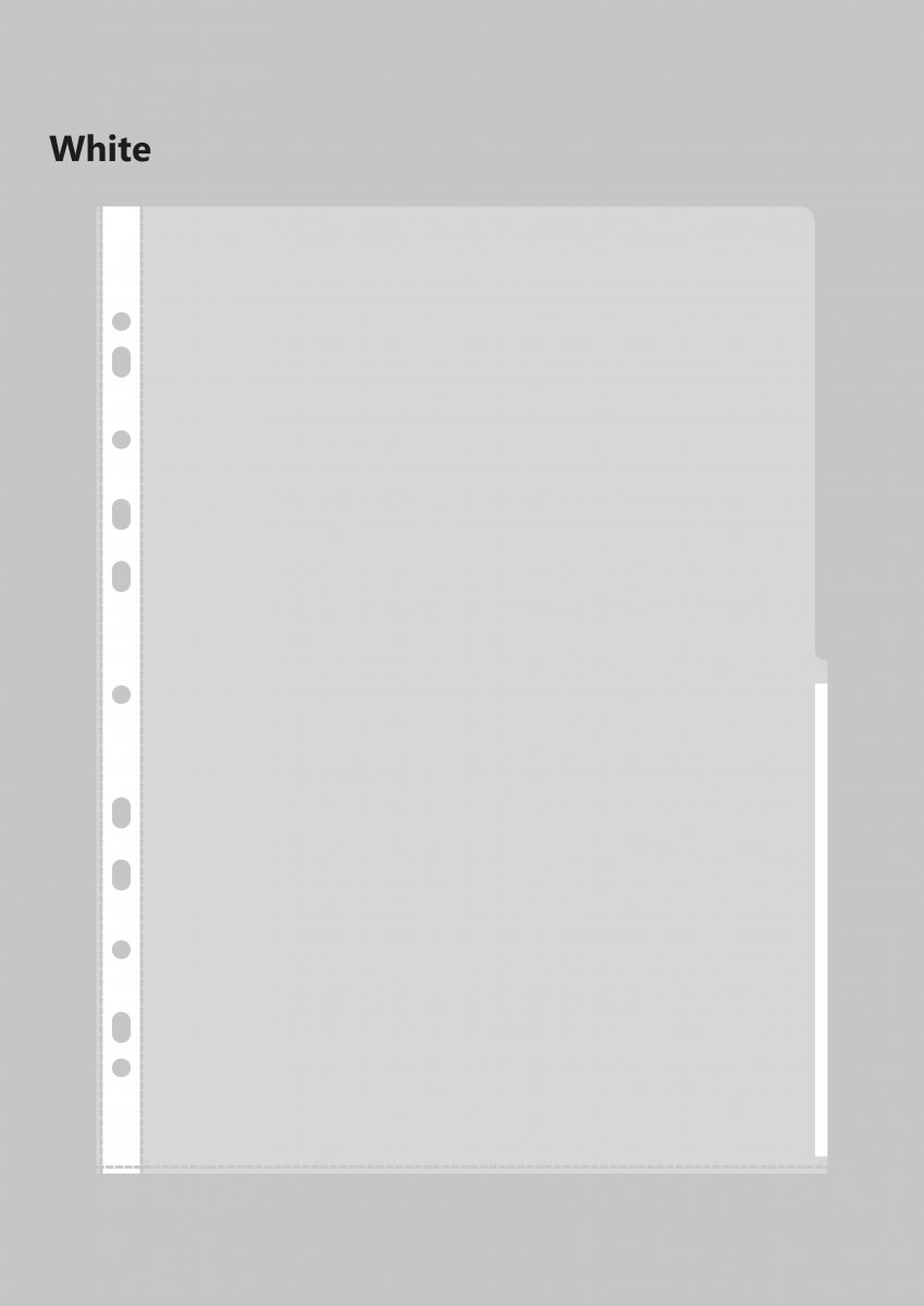 Gennemsigtige lommer i A4-format med multiperforering og farvekode. Med åben top og halvvejs nede i højre side. Fremstillet af miljøvenlig polypropylen. Lommerne er kopisikre og kan rumme op til 25 ark (80gsm).
